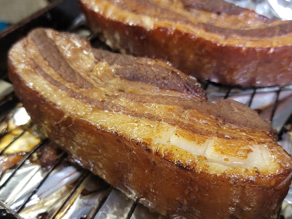 特製のたれで一晩漬けこみ、じっくり煮込んだ豚バラ肉をオーブンでこんがり焼いた